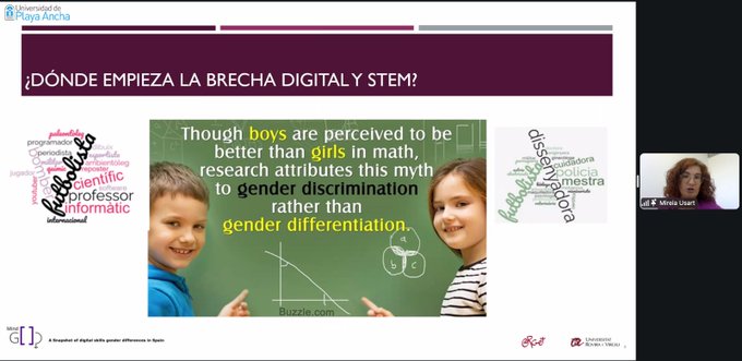 Captura de la videoconferència que mostra alguns dels resultats sobre la percepció de nens i nenes en relació a la bretxa digital de gènere i STEM.