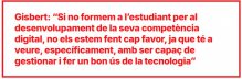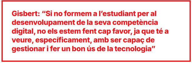 En referència a la competència digital docent, Mercè Gisbert ens afirma que ''si no formem a l’estudiant per al desenvolupament de la seva competència digital, no els estem fent cap favor, ja que té a veure, específicament, amb ser capaç de gestionar i fer un bon ús de la tecnologia’’.