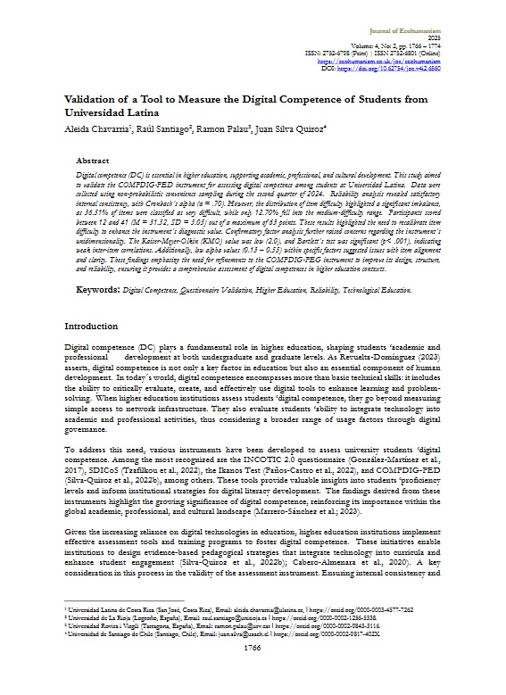 Chavarria, A., Santiago, R., Palau, R., & Silva, J. (2025). Validation of a Tool to Measure the Digital Competence of Students fron Universidad Latina. Journal of Ecohumanism, 4(2). https://doi.org/10.62754/joe.v4i2.6560 |