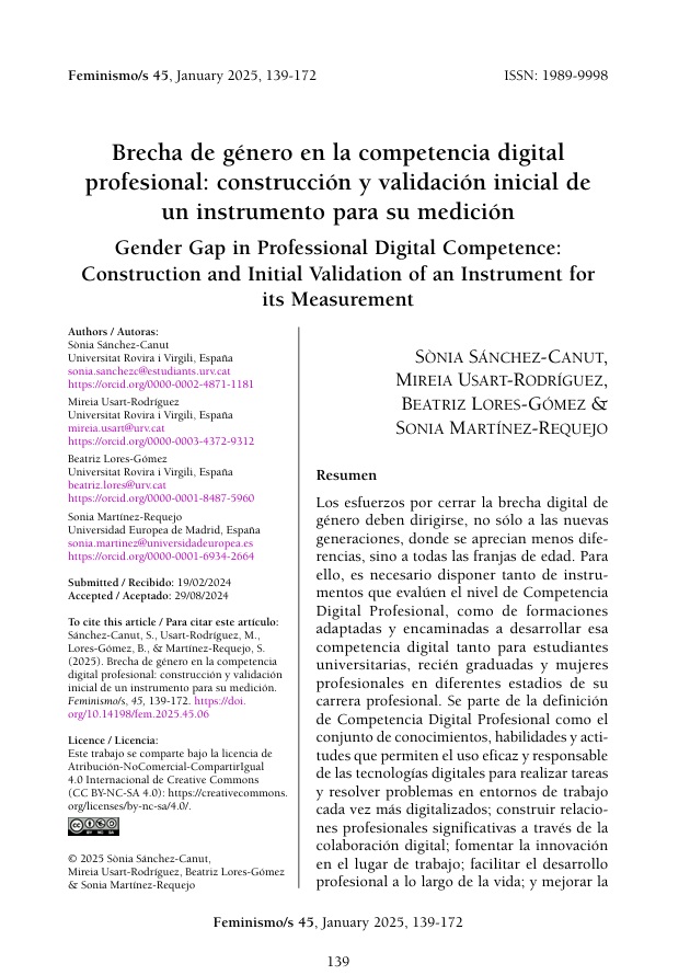 Sanchez, S., Usart, M., Lores, B. & Requejo, S. (2025). Brecha de género en la competencia digital profesional: construcción y validación inicial de un instrumento para su medición. Feminismo/s. Revista del Centro de Estudios sobre la Mujer de la Universidad de Alicante, 45, 139-172. htttps://doi.org/10.14198/fem.2025.45.06 |