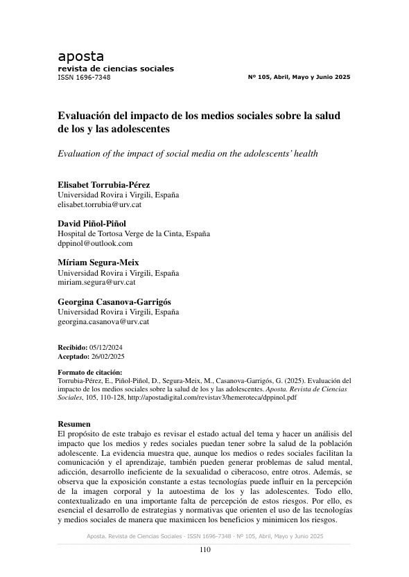 Torrubia, E., Piñol, D., Segura, M. & Casanova, G. (2025). Evaluación del impacto de los medios sociales sobre la salud de los y las adolescentes. Aposta. Revista de Ciencias Sociales, 105, 110-128. https://www.apostadigital.com/revistav3/hemeroteca/dppinol.pdf |