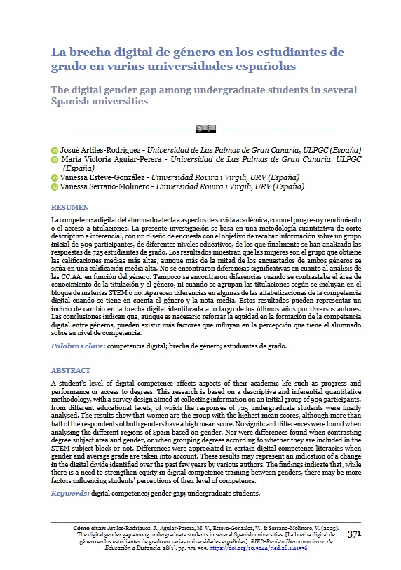 Artiles-Rodríguez, J., Aguiar-Perera, M. V., Esteve-González, V., & Serrano-Molinero, V. (2025). La brecha digital de género en los estudiantes de grado en varias universidades españolas. RIED-Revista Iberoamericana De Educación a Distancia, 28(1), 371-395. https://doi.org/10.5944/ried.28.1.41536 |