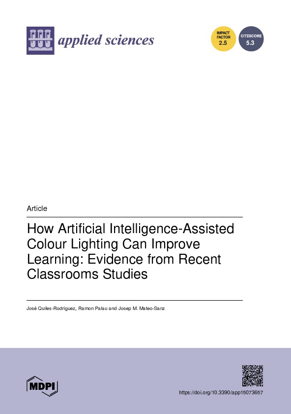 Quiles-Rodríguez, J., Palau, R., & Mateo-Sanz, J. M. (2025). How Artificial Intelligence-Assisted Colour Lighting Can Improve Learning: Evidence fron Recent Classrooms Studies. Applied Sciences, 15(7), 3657. https://doi.org/10.3390/app15073657 |