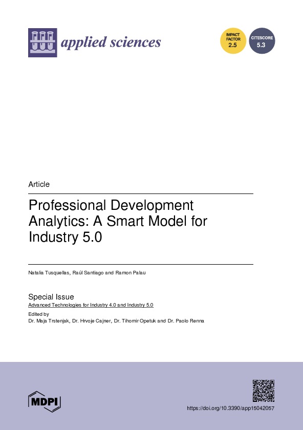 Tusquellas, N., Santiago, R. & Palau, R. (2025). Prefessional Development Analytics: A Smart Model for Industry 5.0. Applied Sciences, 15(4), 2057. https://doi.org/10.3390/app15042057 |