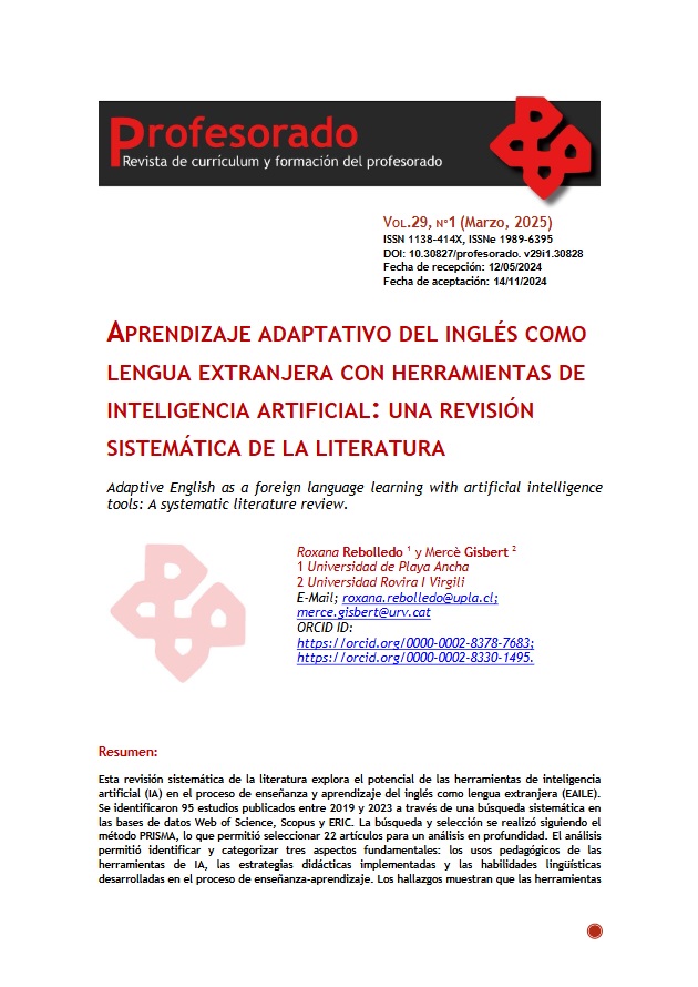 Rebolledo, R., & Gisbert, M. (2025). Aprendizaje adaptativo del inglés como lengua extranjera con herramientas de inteligencia artificial: una revisión sistemática de la literatura. Profesorado, Revista De Currículum Y Formación Del Profesorado, 29(1), 241-264. https://doi.org/10.30827/profesorado.v29i1.30828 |