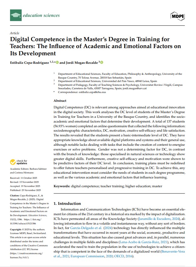 Cepa-Rodriguez, E., & Mogas-Recalde, J. (2025). Digital Competence in the Master's Degree in Training for Teachers: The Influence of Academic and Emotional Factors on Its Development. Education Sciences, 15(12), 1586. |