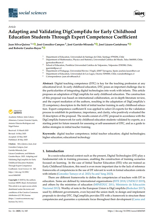 Silva, J., González, J., Garrido, J., Lázaro, J. L., & Canales, R. (2025). Adapting and Validating DigCompEdu for Early Childhood Education Students Through Expert Competence Coefficient. Social Sciences, 14(6). https://doi.org/10.3390/socsci14060345 |