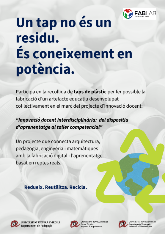 En el marc del projecte d'innovació docent INDOC - "Innovació docent interdisciplinària: del dispositiu d'aprenentatge al taller competencial", estem recollint taps de plàstic que serviran com a material per a la fabricació d'un artefacte educatiu desenvolupat col·lectivament amb el suport del FabLab Terres de l'Ebre.