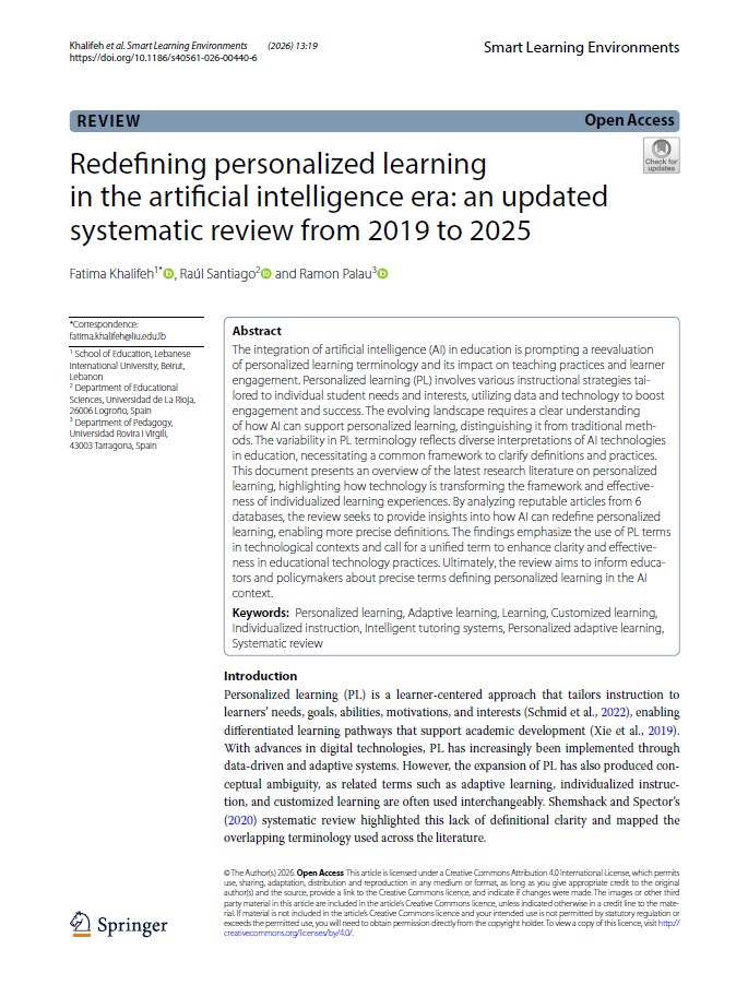 Khalifeh, F., Santiago, R. & Palau, R. (2026). Redefining personalized learning in the artificial intelligence era: an updated systematic review from 2019 to 2025. Smart Learn. Environ. 13, 19.