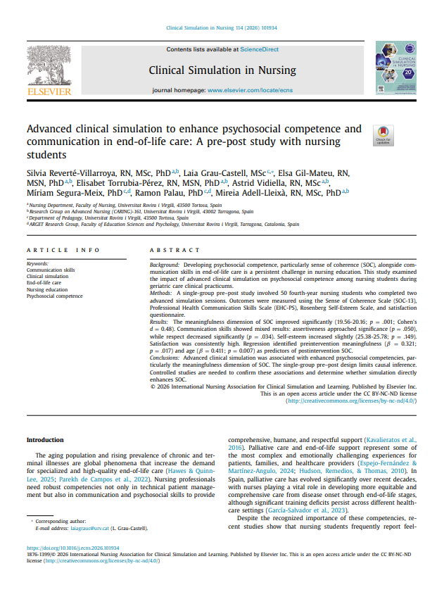 Reverte-Villarroya, S., Grau-Castell, L., Gil-Mateu, E., Torrubia-Pérez, E., Vidiella, A., Segura-Meix, M., Palau-Martín, R., & Adell-Lleixà, M. (2026). Advanced clinical simulation to enhance psychosocial competence and communication in end-of-life care: A pre-post study with nursing students. Science Direct, 114.