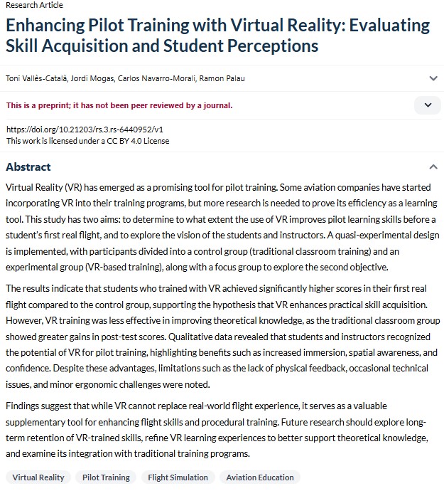 Vallès-Català, T., Mogas, J., Navarro-Morali, C., & Palau, R. (2025). Enhancing Pilot Training with Virtual Reality: Evaluating Skill Acquisition and Student Perceptions. Research Square. |
