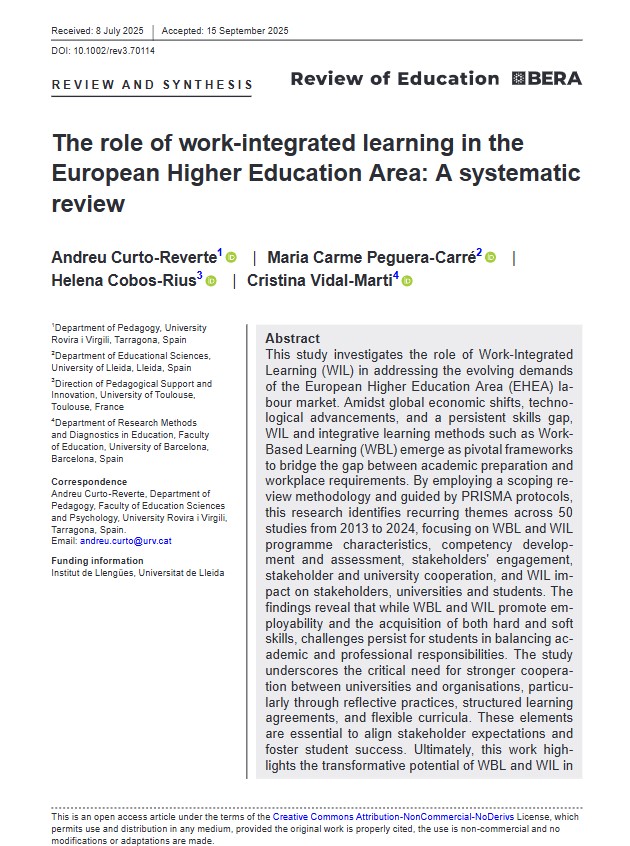 Curto‐Reverte, A., Peguera‐Carré, M. C., Cobos‐Rius, H., & Vidal‐Marti, C. (2025). The role of work‐integrated learning in the European Higher Education Area: A systematic review. Review of Education, 13(3), e70114. |