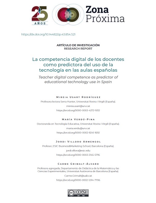 Usart-Rodríguez, M., Verdú-Pina, M., Villoro-Armengol, J., & Grimalt-Álvaro, C. (2025). La competencia digital de los docentes como predictora del uso de la tecnología en las aulas españolas.Zona Próxima, Revista del Instituto De Idiomas, Universidad del Norte. 43 (1). |