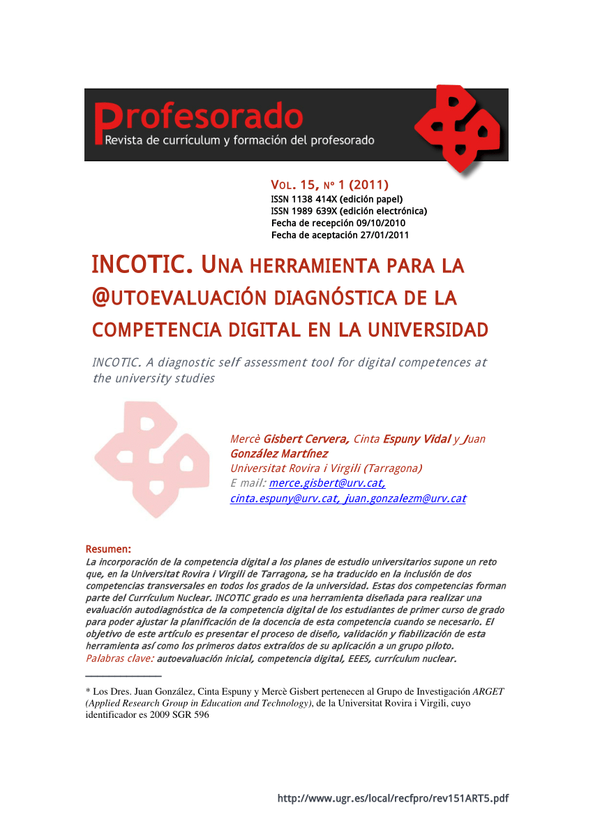 Gisbert, M., Espuny, C., & González, J. (2011). INCOTIC. Una herramienta para la @utoevaluación diagnóstica de la competencia digital en la universidad. Profesorado. Revista de currículum y formación del profesorado, 15(1), 76-90. |