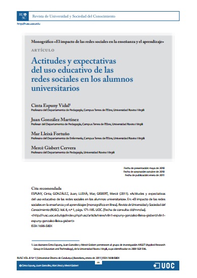 Espuny, C., González, J., Lleixà, M., & Gisbert, M. (2011). Actitudes y expectativas del uso educativo de las redes sociales en los alumnos universitarios. RUSC. Revista de Universidad y Sociedad del Conocimiento, 8(1), 171-185. |