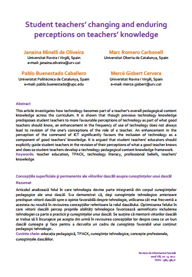 De Oliveira, J.M., Romero, M., Buenestado, P., & Gisbert, M. (2011). Student teachers' changing and enduring perceptions on teachers' knowledge. Romanian Journal of Social Informatics, 15(8), 27-35. |
