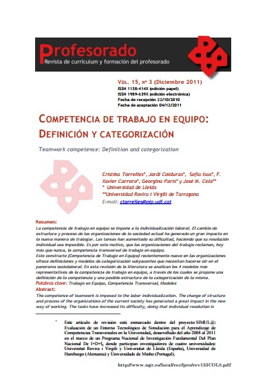 Torrelles, C., Coiduras, J., Isus, S., Carrera, F.X., París, G., & Cela-Ranilla, J.M. (2011). Competencia de trabajo en equipo: Definición y Categorización. Profesorado. Revista de currículum y formación del profesorado, 15(3), 330-344. |