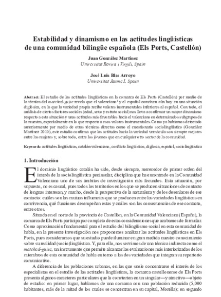 González, J. G., & Blas, J.L. (2011). Estabilidad y dinamismo en las actitudes lingüísticas de una comunidad bilingüe española (Els Ports, Castellón). Hispania, 94(4), 663-679. http://muse.jhu.edu/article/461900 |