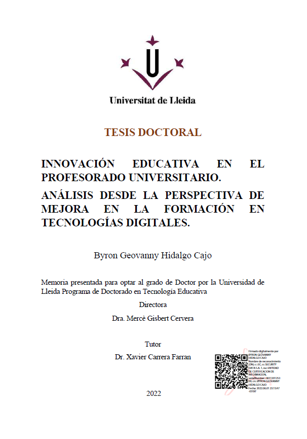 Autor: Byron Geovanny Hidalgo Cajo Titol: Innovación educativa en el profesorado universitario. Análisis desde la perspectiva de mejora en la formación en tecnologías digitales Director/a: Mercè Gisbert Cervera Data de lectura: 20 de octubre de 2022 Enllaç: pdf |
