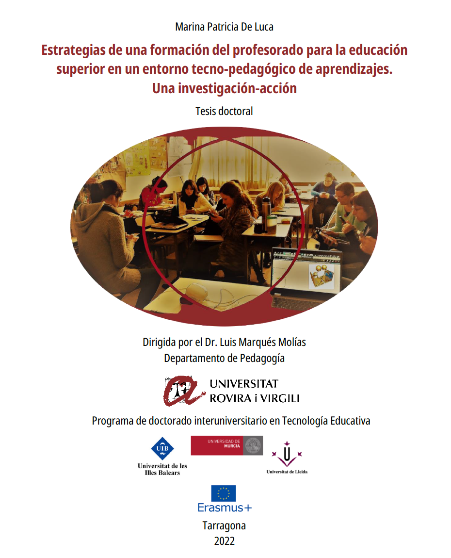 Autor: Marina Patricia De Luca Titol: Estrategias de una formación del profesorado para la educación superior en un entorno tecno-pedagógico de aprendizajes. Una investigación-acción. Director/a: Luis Marqués Molías Data de lectura: 19 de juliol de 2022 Enllaç: pdf |